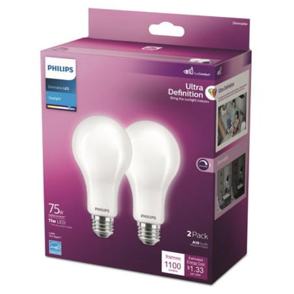 Philips Ultra Definition 75W Equivalent Daylight A21 Medium LED Light Bulb, Frosted (2-Pack)